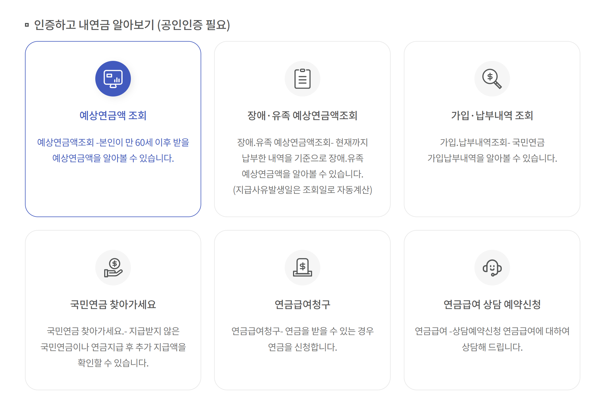 연금공단 홈페이지나 모바일 앱 "내 곁에 국민연금"을 통해서도 예상 국민연금 수령액을 확인할 수 있어요. [예상연금액 조회하기] 메뉴로 들어가시게 되면 만 60세 이후에 내가 받게 될 국민연금 수령액 알아보기가 가능해요.