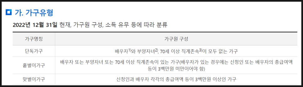 홑벌이가구: 배우자나 부양하는 자녀 또는 70세 이상의 직계존속이 있는 가구여야 합니다. (배우자가 소득이 있으면 신청인 또는 배우자의 총 급여액이 300만원 이하)
