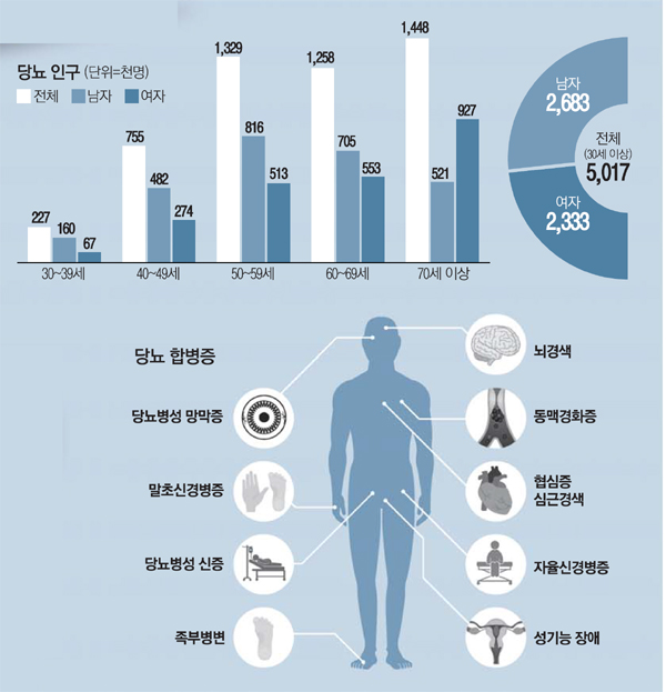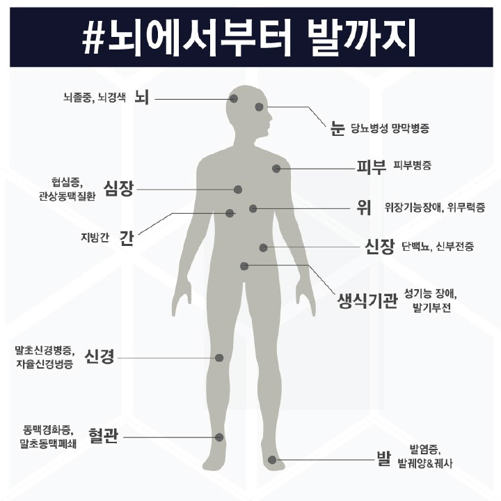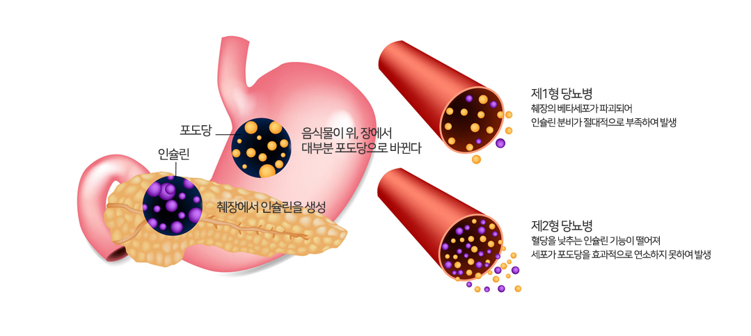 당뇨병이란 말 그대로 소변을 통해 포도당이 빠져 나오는 질환을 말하는 것으로 음식물을 섭취하게되면 에너지원인 포도당으로 바꿔 몸에서 이용되어야 합니다. 하지만 인슐린이 몸 안에서 정상적으로 작용하지 못하게되면 혈액 속의 포도당이 정상범위를 벗어나 올라가게 되고 당이 체외로 배출되게 되며 고혈당이 장기간 계속되면 여러 가지 당뇨병성 합병증을 초래하므로 관리가 반드시 필요해요.