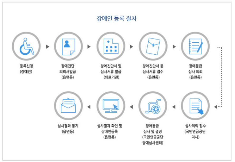 장애등록심사는 장애인 등록을 하기 위해 장애정도를 심사하는 제도인데요. 장애진단서, 검사결과지 등을 주민센터에 제출하게되면 주민센터에서 서류 검토 후, 국민연금공단에서 종합하여 검토하고 장애등급을 판정해요.